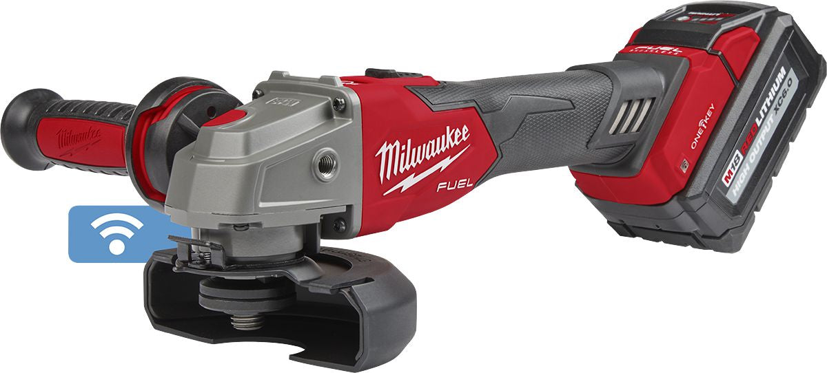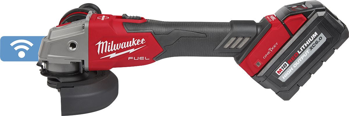 The M18 FUEL™ 4-1/2" / 5" Braking Grinder with ONE-KEY™ Slide Switch, Lock-On is the next advancement in power and performance of cordless grinders while enhancing safety with its RAPIDSTOP™ Brake. The M18 FUEL™ 4-1/2" / 5" Braking Grinder with ONE-KEY™ generates 11A corded power to complete the toughest grinding and cutting applications. The POWERSTATE™ Brushless Motor delivers maximum sustained power and 8,500 RPM to remove material faster and increase productivity. The RAPIDSTOP™ Brake provides stop times under 2 seconds with an abrasive disc. The M18 FUEL™ 4-1/2" / 5" Braking Grinder with ONE-KEY™ includes an electronic clutch for kickback protection, as well as overload protection to maximize motor life.Compatible with ONE-KEY™, this grinder wirelessly connects to a smartphone to track and manage the tool, providing visibility to where tools are across your network of jobs.