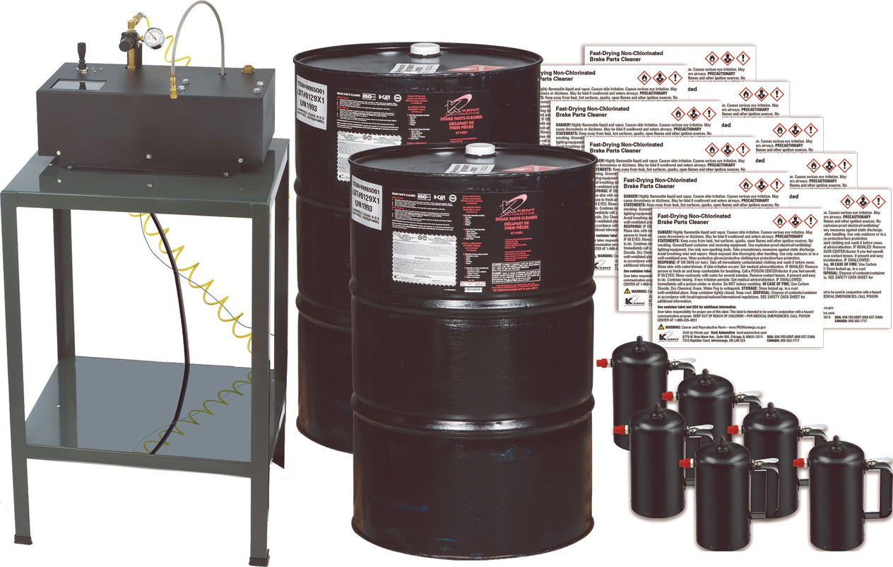 Eliminate the need for costly aerosol cans with our drum brake cleaner bundle. Contains essentials for drum brake cleaning including one drum of 55 gallon brake and parts cleaner, a Kwik and EZ Fill System, four Kwik and EZ 32oz. applicators and five 10% VOC transfer labels. Put this brake cleaning system to work in your shop or garage.