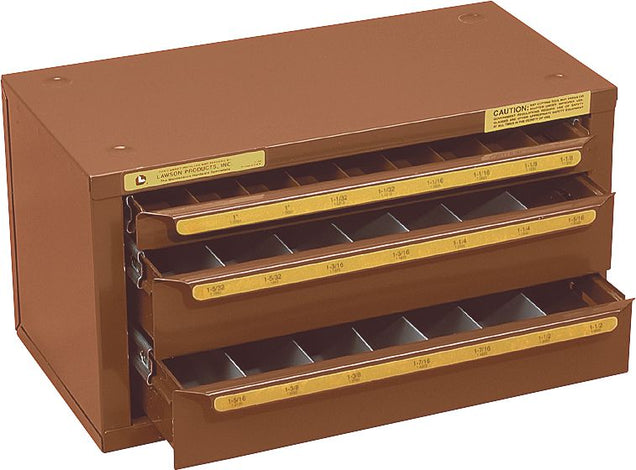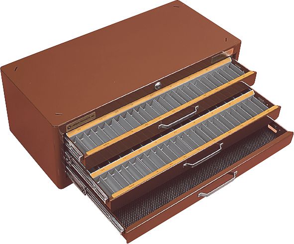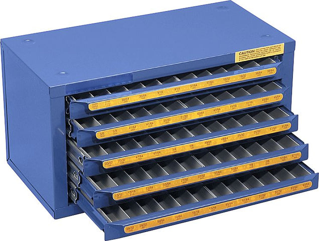 Holds end mills from 1/8" to 1" 84 compartments and a deep bottom drawer for additional storage