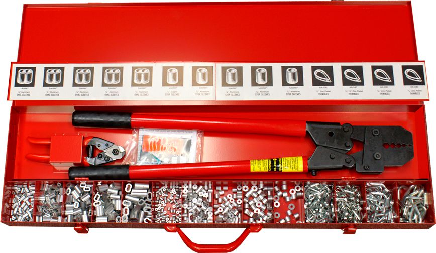 All you need to swage popular sizes. Contains #1-SC Hand Tool, a C7 Cable Cutter, assortment of stop and oval sleeves, assortment of thimbles. Handle all sizes from 1/16" up to and including 3/16". Packaged in rugged steel tool box. Gauge included