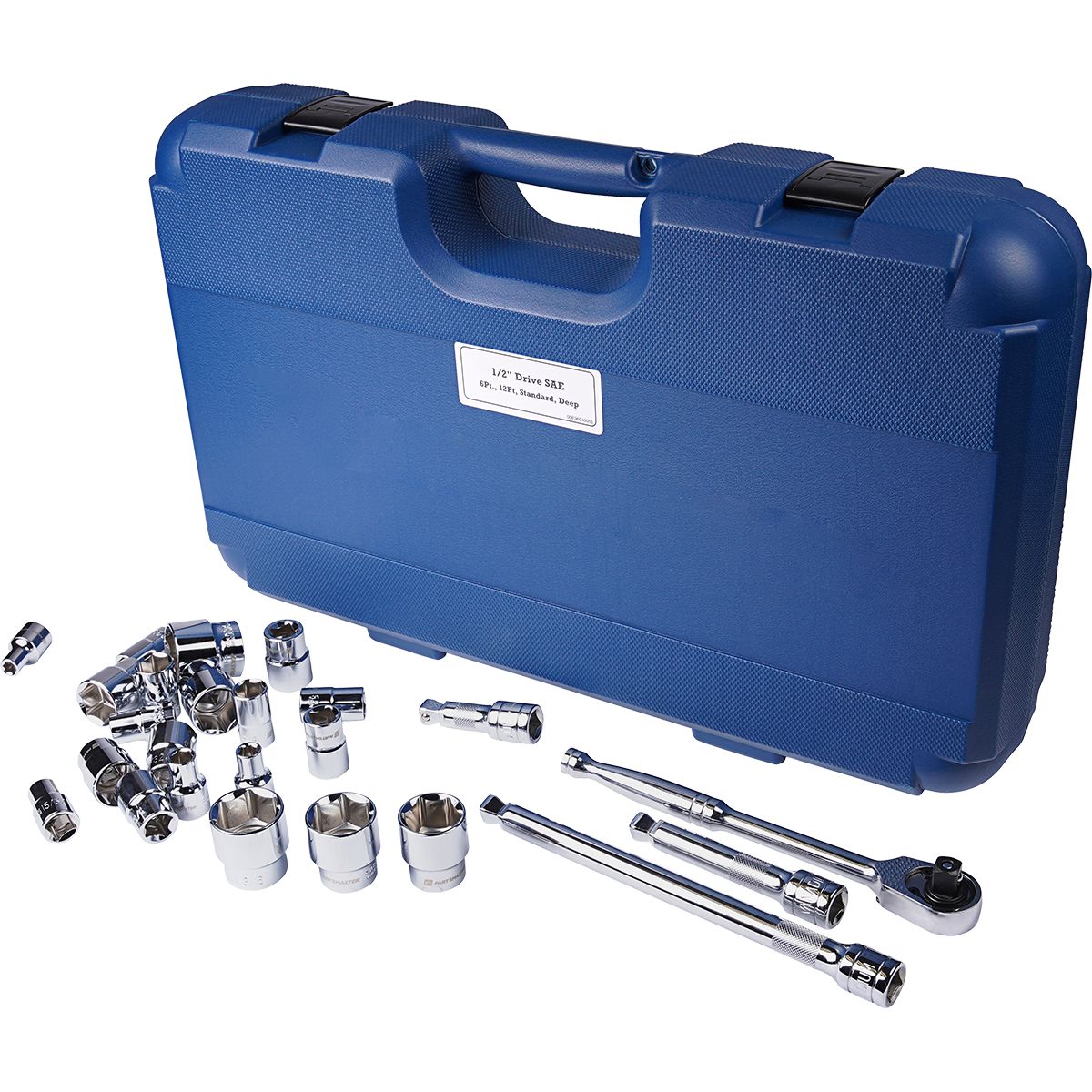 A complete set of sockets and drive tools in one custom convenient patented blow molded case with a snap-lok socket and tool feature that securely holds tools in place Blow molded raised size and style identifiers provide for simple location, organization, extracting and replacing